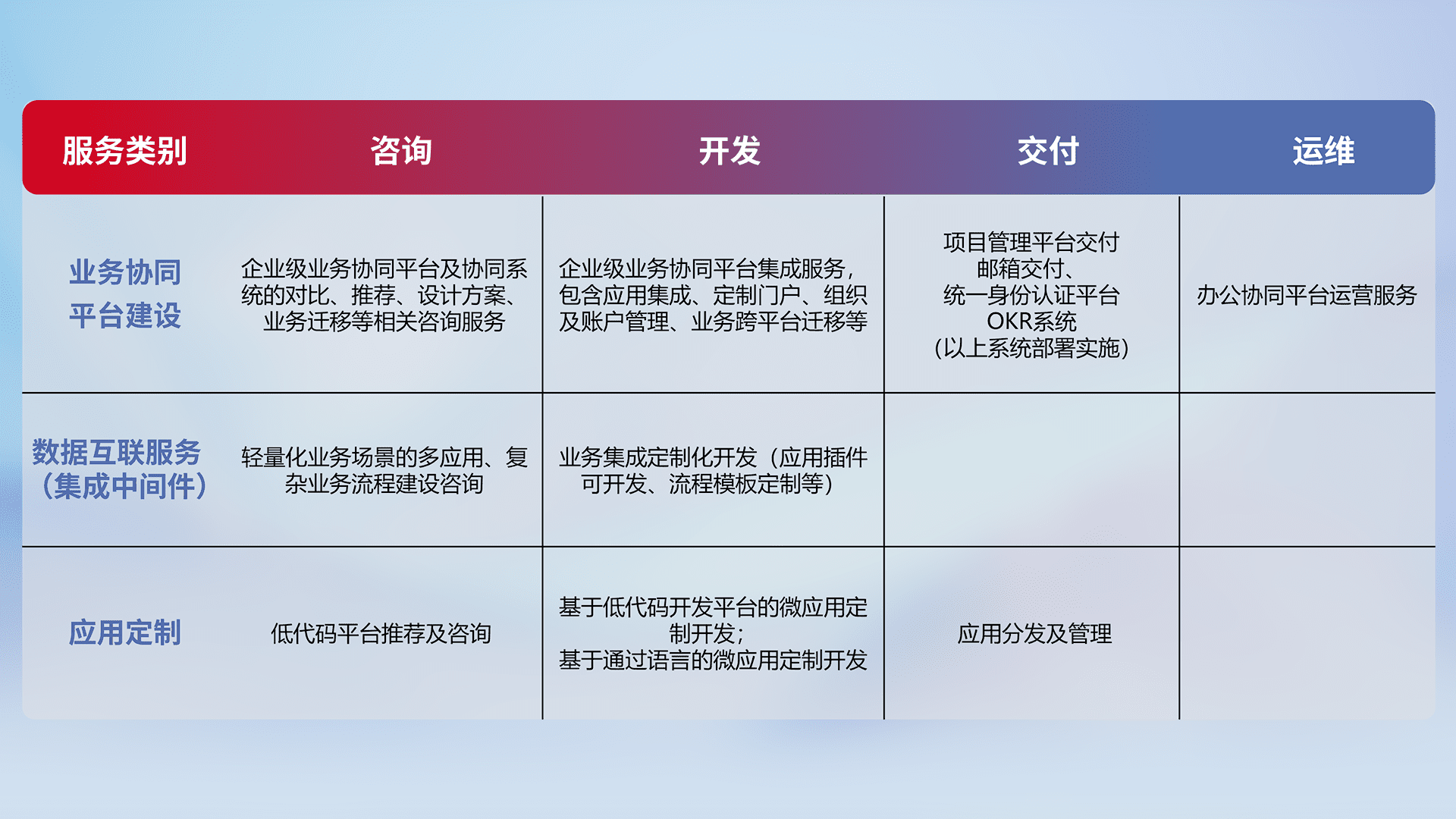 针对钉钉、、企微、、IDaas等平台级产品提供产品的规划、、、方案、、、交付、、定制化开发等服务,,实现如统一协同办公、、、智能客户服务、、、混合会议管理、、、、智能数据查询、、、等业务场景,,,,实现数字化转型。。。。