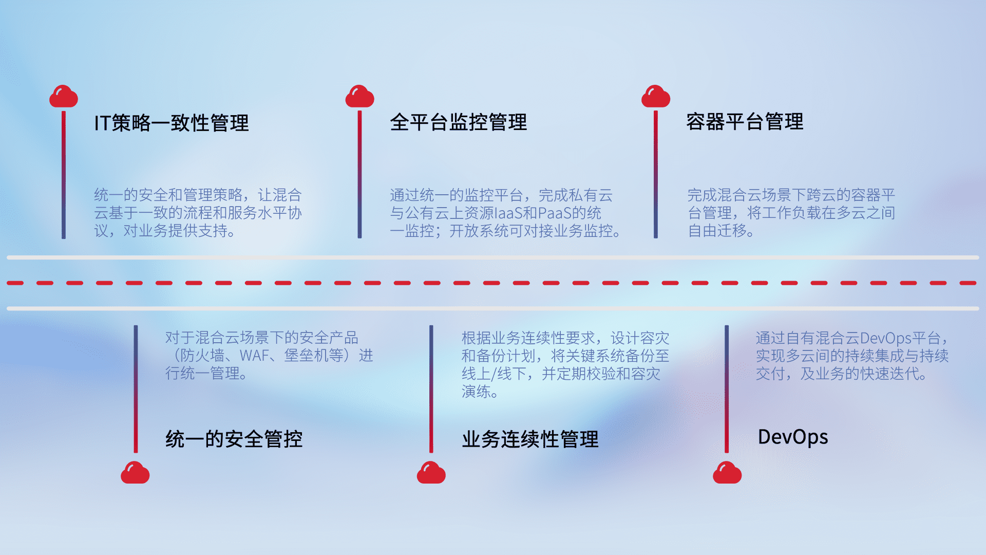 通过多云纳管,,以统一的资源数据模型把客户的云资源进行抽象和封装,,,,进而实现对多云资源的统一操作,,,保障云资源管理的可靠性、、稳定性与可用性。。。量身定制化运维内容,,,配置、、、、开发运维、、、补丁管理、、备份、、、监控、、、认证和访问管理、、、审计和日常巡检等,,,保障在用云过程中的可靠度,,,,稳定度以及高可用率。。。。